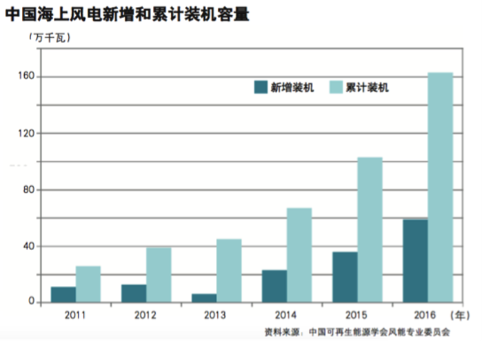 自2010年首個(gè)海上風(fēng)電并網(wǎng)項(xiàng)目上海東海大橋海上風(fēng)電場(chǎng)建成投產(chǎn)以來(lái),在此后的3年里,江蘇如東3萬(wàn)千瓦和15萬(wàn)千瓦潮間帶試驗(yàn)、示范風(fēng)電場(chǎng)及其擴(kuò)建工程陸續(xù)建成。2012年底,我國(guó)海上風(fēng)電累計(jì)裝機(jī)接近40萬(wàn)千瓦;受各種因素影響,2013年海上風(fēng)電發(fā)展顯著減緩;自2014年以來(lái),我國(guó)海上風(fēng)電裝機(jī)迅速增加,當(dāng)年新增并網(wǎng)容量約20萬(wàn)千瓦,全部位于江蘇省;2015年新增裝機(jī)容量為36萬(wàn)千瓦,主要分布在江蘇省和福建省;2016年新增裝機(jī)154臺(tái),容量達(dá)到59萬(wàn)千瓦。截至2016年底,我國(guó)已建成海上風(fēng)電累計(jì)裝機(jī)容量162萬(wàn)千瓦,在全球僅次于英國(guó)與德國(guó)。我國(guó)海上風(fēng)電占全國(guó)風(fēng)電總裝機(jī)容量的比重由2011年的0.42%上升至2016年的0.96%。