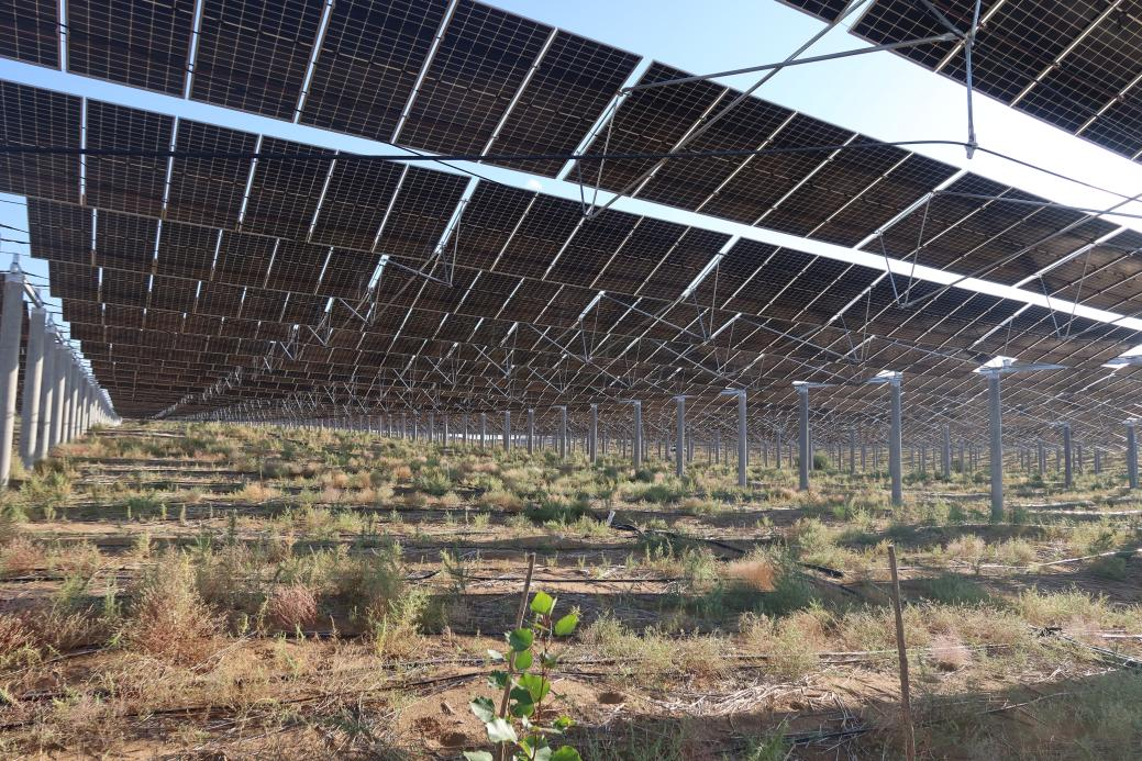 庫布其項目充分利用沙漠地區特有的豐富光照資源及土地,采用“板上雙面發電、板下雙層生態、板間雙層養殖”的立體生態光伏治沙模式,充分發揮光伏空間優勢,以組件板減少蒸發、以組件基礎固沙、板下種植養殖、以作物治沙改土,光伏板建設、板下種植與畜牧養殖的生態良性互動,可有效遏制沙丘移動、治沙改土,創造綠色生態效益、經濟效益。在項目實施過程中,通過因地制宜、因時制宜地采取光伏區治沙、林光固沙帶建設、沙漠生態養殖、柔性支架區域生態種植等具體措施,實現沙漠修復治理和生態環境保護;項目建設和運行期間,可以吸引當地牧民參與項目建設,實現穩定就業。