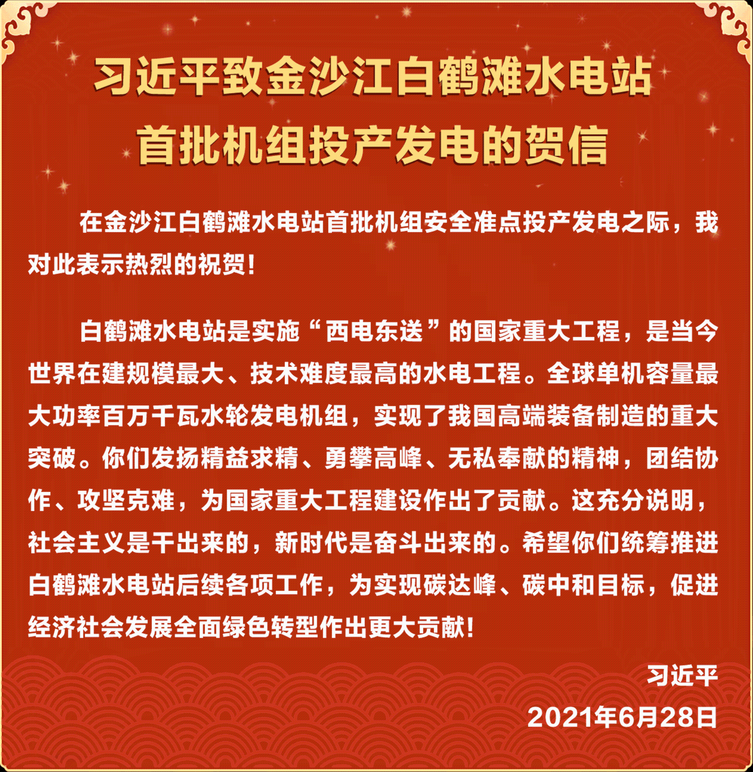 新華社北京6月28日電 金沙江白鶴灘水電站首批機組于28日安全準點投產發電。中共中央總書記、國家主席、中央軍委主席習近平發來賀信,表示熱烈的祝賀。[詳情]