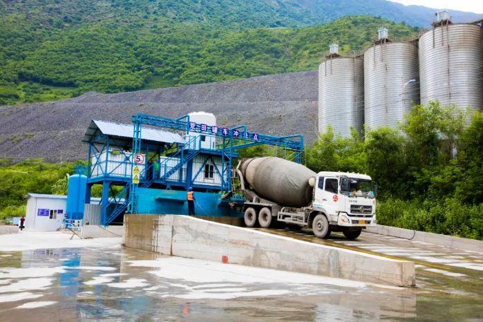 一輛滿載混凝土砂石骨料的罐車駛入工地,將物料傾倒入工作倉面后,趕往混凝土罐車沖洗點“洗澡”——清理罐車內部,防止砂石渣料殘留,影響骨料配比。