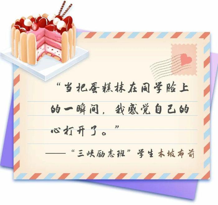 2019年的 “小升初”,木坡布前以全縣第146名的成績(jī)進(jìn)入了“三峽勵(lì)志班”。?“只知道埋頭學(xué)習(xí),不懂得和同學(xué)、老師交流。”這是“三峽勵(lì)志班”班主任王世美對(duì)木坡布前的第一印象。不善溝通,是大山里的孩子們普遍存在的問(wèn)題。“不是不想,而是不知道怎么和老師同學(xué)們交流,”木坡布前回憶道。初一上學(xué)期,“三峽勵(lì)志班”舉辦了一個(gè)以“集體生日”為主題的班級(jí)活動(dòng),一個(gè)雙層蛋糕被分成48塊,班上的每個(gè)同學(xué)一塊。