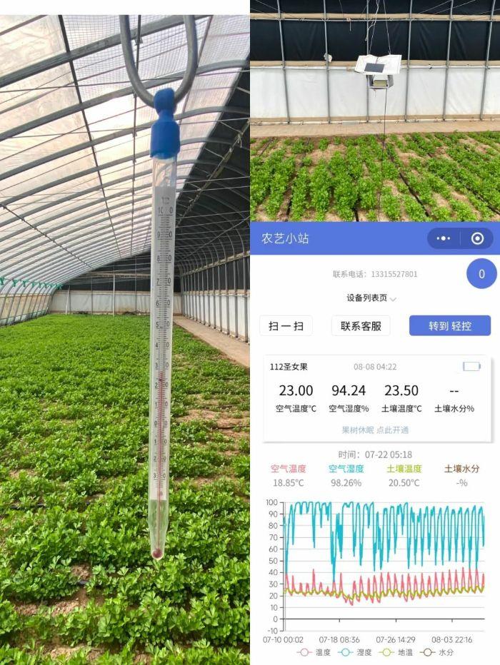 在農(nóng)業(yè)溫室大棚內(nèi)部仔細(xì)觀察可以發(fā)現(xiàn),農(nóng)業(yè)數(shù)字化應(yīng)用成果頗具亮點(diǎn)。200多座大棚內(nèi)全部應(yīng)用了溫度和濕度實(shí)時(shí)監(jiān)控裝置,溫度數(shù)據(jù)會實(shí)時(shí)傳送到手機(jī)軟件上,幫助工作人員分析溫室大棚里的環(huán)境條件。同時(shí),大棚內(nèi)地面敷設(shè)有自動灑水裝置,當(dāng)大棚內(nèi)溫度升高,自動灑水裝置將啟動灑水,既可以進(jìn)行降溫,又可以進(jìn)行農(nóng)作物灌溉。大棚外的遮陽保溫篷布則通過定時(shí)控制裝置進(jìn)行升起與降落,白天時(shí)全部敞開,到了夜晚就會自動關(guān)合,確保了溫室大棚內(nèi)農(nóng)作物在白天受到充足的日照,在夜間還可以保持恒溫狀態(tài)。