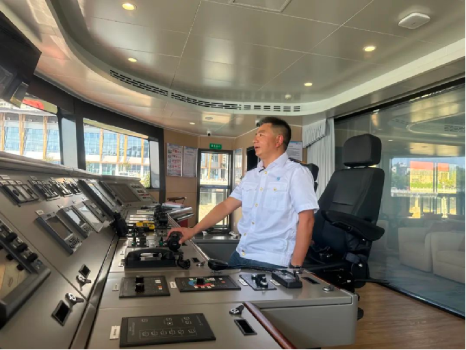▲?曾擔(dān)任過總船長的湖北三峽旅游集團(tuán)葉勇在船舶駕駛室。攝影:黃欣