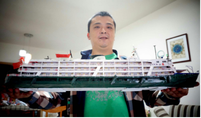 ▲?長江船舶愛好者王軒和他制作的“江渝4”號(hào)客輪模型。此船換色改名后,現(xiàn)收藏于奉節(jié)縣詩城博物館